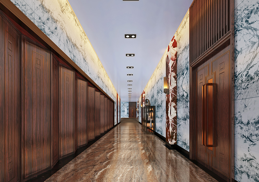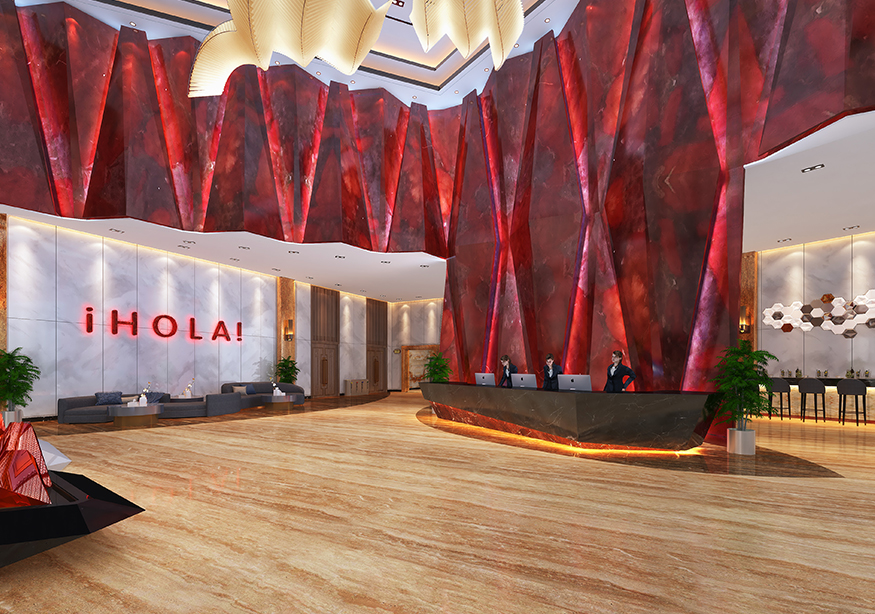 以朱砂的棕紅色為主色調(diào),配以奢華的裝潢、大氣的全無(wú)柱式挑高設(shè)計(jì)。
