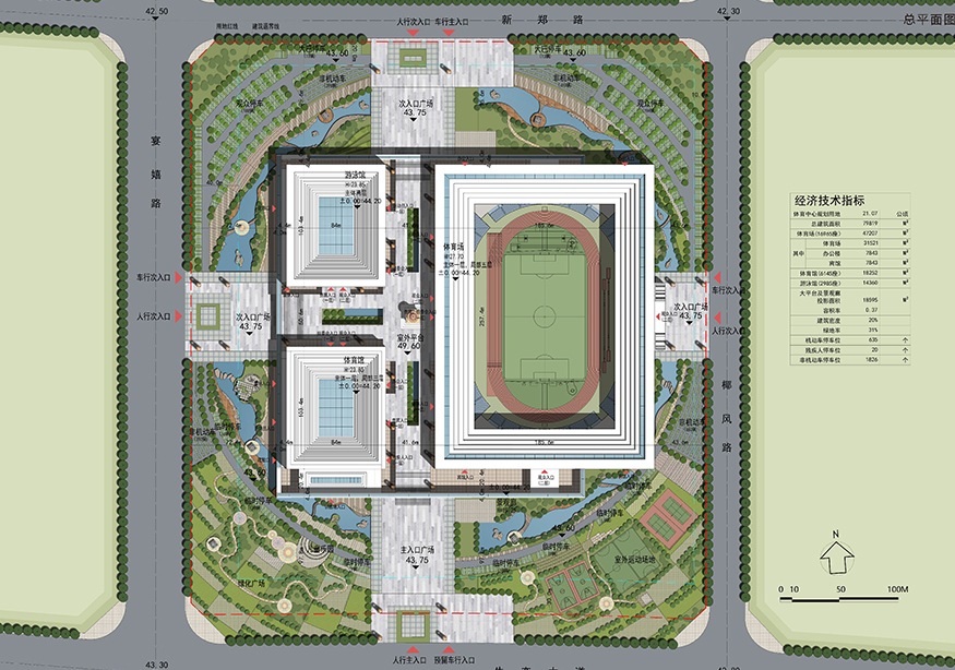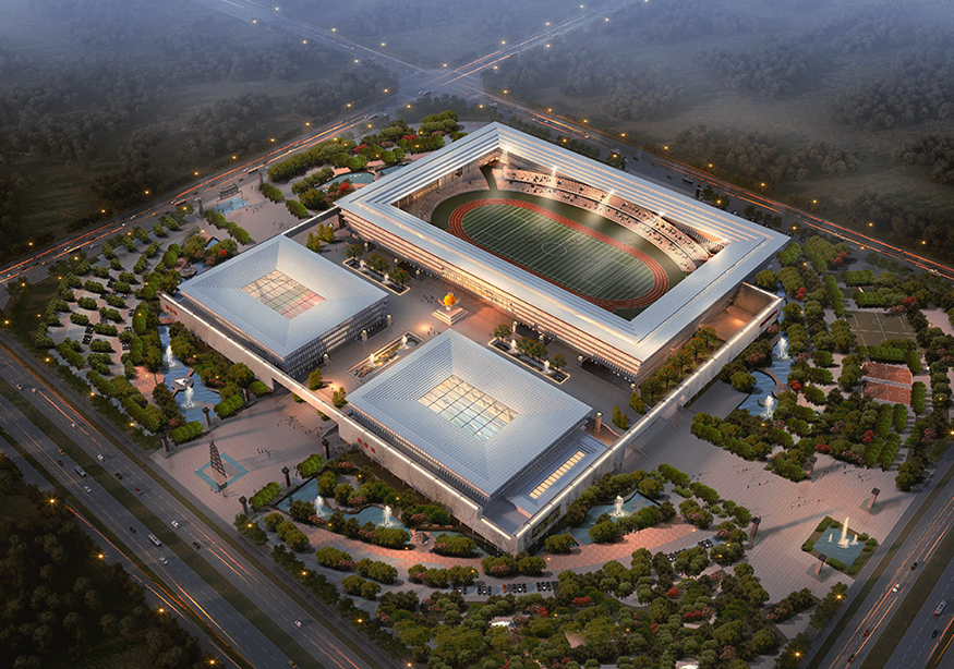 單體,建筑總面積約為62295㎡,包含體育場(chǎng)一座(占地約15100㎡)、體育館一座(占地約5123㎡)、游泳館一座(占地約1158㎡),可以滿足并承接省級(jí)比賽的賽事要求。另約有3015㎡的配套商業(yè)用房,預(yù)留為體育中心建設(shè)停車場(chǎng)、全民健身廣場(chǎng)、公園綠地等服務(wù)設(shè)施和配套設(shè)施。