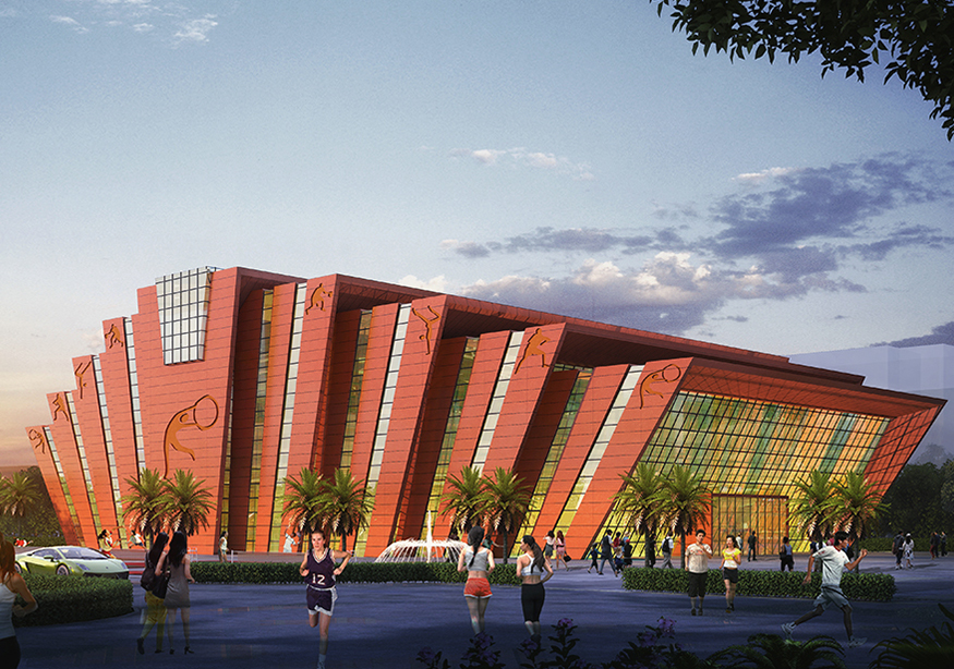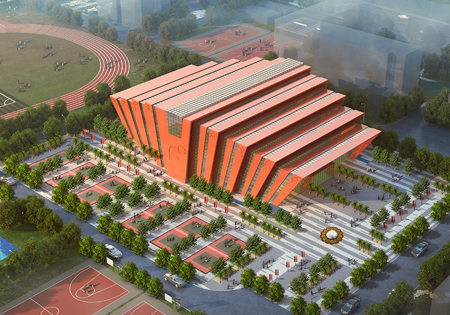 原學(xué)校顏色以灰白色為主要色調(diào),中學(xué)是一個(gè)年輕人集聚的場(chǎng)所是一群有朝氣,活潑的祖國(guó)未來(lái)的花朵。紅色代表著熱量、活力與意志力。因此體育館設(shè)計(jì)采用紅色作為主要色調(diào)。符合體育館的建筑性格。點(diǎn)綴整個(gè)校園,點(diǎn)燃學(xué)生的激情。