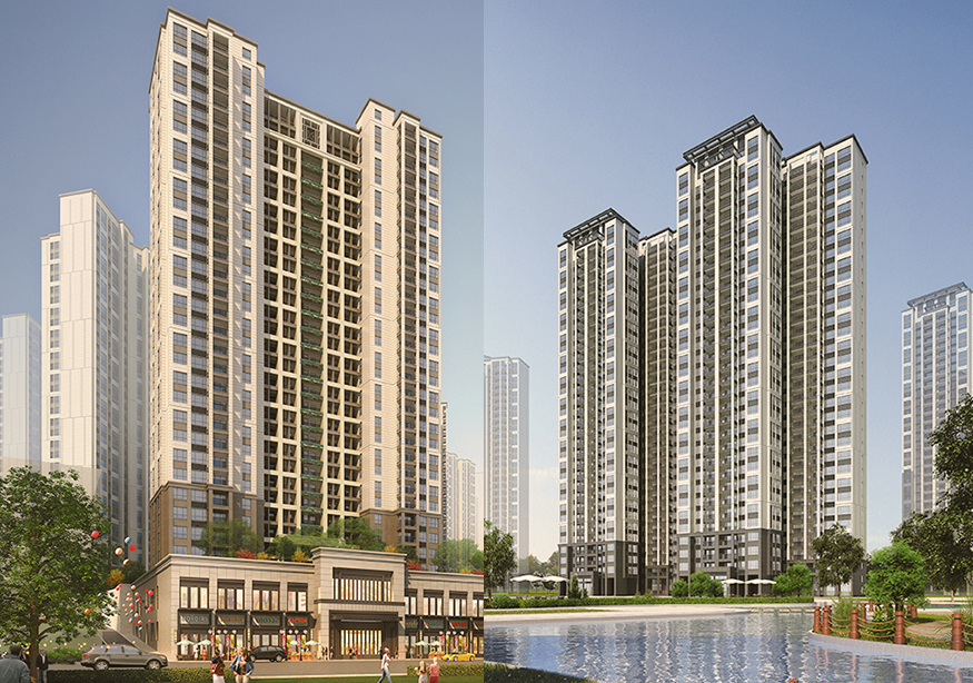 小區(qū)規(guī)劃高層住宅19棟(1號(hào)樓T9號(hào)樓),除19號(hào)樓為28層,6、7、10、11號(hào)樓為30 層,3號(hào)樓為31層,其余均為32層住宅建筑;幼兒園1棟三層,2層的沿街商鋪設(shè)置在街道路一側(cè),朝向多為南向,朝向優(yōu)越。